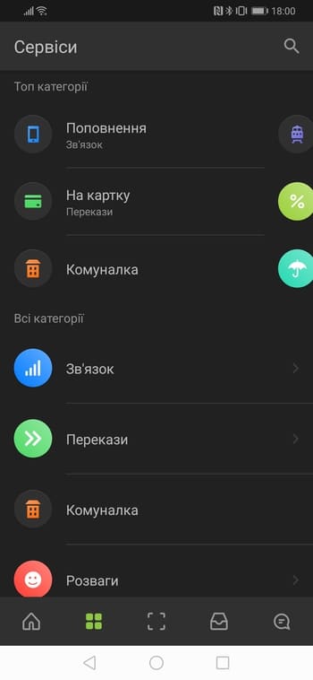 У нижній частині екрана програми розташовані вкладки меню, перша — це головний екран, друга — сервіси, третя — архів останніх дій, четверта — сканер штрих-кодів, а п’ята — оповіщення. У меню “Сервіси” користувач знайде всі основні можливості, які зараз пропонує Приват24. У порівнянні з минулою версією вони не змінилися, але навігація по ним стала краще, хоча все ще залишається трохи заплутаною.