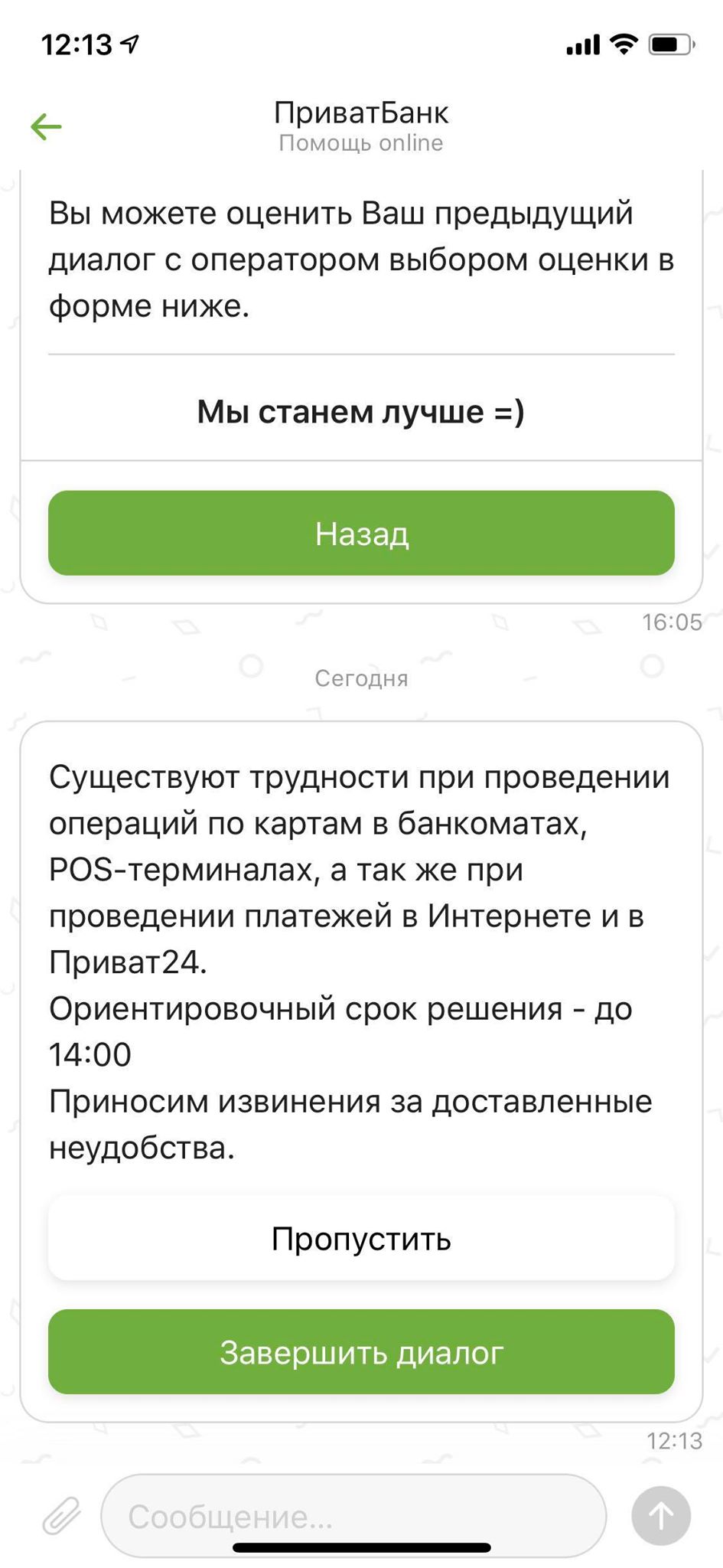 Служба поддержки Приватбанка также отмечает возникшие неполадки в работе банка. "Существуют трудности при проведении операций по картам в банкоматах, POS-терминалах, а также при проведении платежей в Интернете и в Приват24. Ориентировочный срок решения- до 14:00. Приносим извинения за доставленные неудобства", - говорится в сообщении техподдержки.