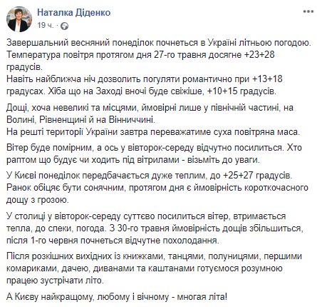 "Дожди, хотя небольшие и местами, вероятны только в северной части, на Волыни, Ровенской и Винницкой области. На остальной территории Украины завтра (27 мая - Прим. Ред.) будет преобладать сухая воздушная масса. Ветер будет умеренным, а вот во вторник-среду ощутимо усилится", - предупреждает синоптик и добавляет, что в Киеве понедельник, 27 мая, будет очень теплым - до +25...+27, но в течение дня есть вероятность кратковременного дождя с грозой.