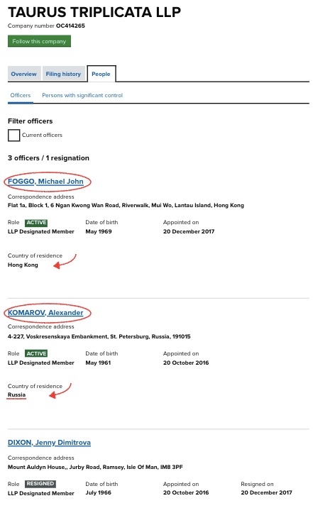 Нам вдалося встановити, що містер Фогго має спільний бізнес у Британії із росіянами. Так, компанія TAURUS TRIPLICATALLP (Company number OC414265) контролюється містером Фогго спільно з громадянином РФ KOMAROV, Alexander. Частки у компанії розділені між Фогго і Комаровим як 75% на 25%.