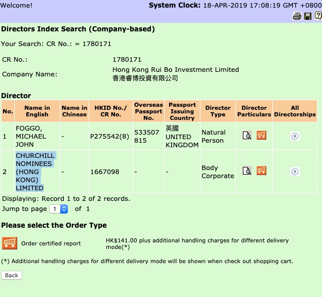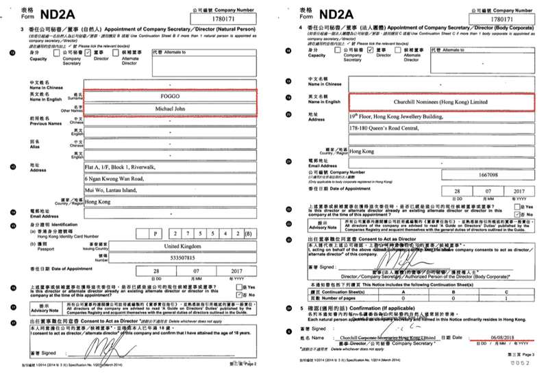 Директором CHURCHILLNOMINEES (HONG KONG) LIMITED також із 2016 року є містер Фогго. Цікаво, що станом на 24.10.2014 року ця компанія була підготовлена спеціально під продаж для громадянина Фогго.