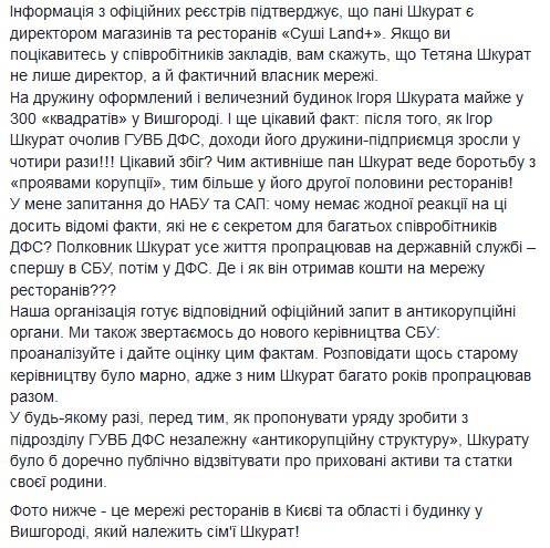 “Согласно официальной декларации, заработная плата полковника Шкурата в прошлом году составляла примерно 40 000 гривен в месяц. Достаточно неплохо. Но, согласитесь, этого мало, чтобы создать сеть из 5 (пяти !!!) ресторанов “Сушиленд+” в Киеве и Киевской области, которыми управляет жена нашего “борца с коррупцией”. Рестораны не указанные в официальной декларации Шкурата “, – отметил Лаврив.