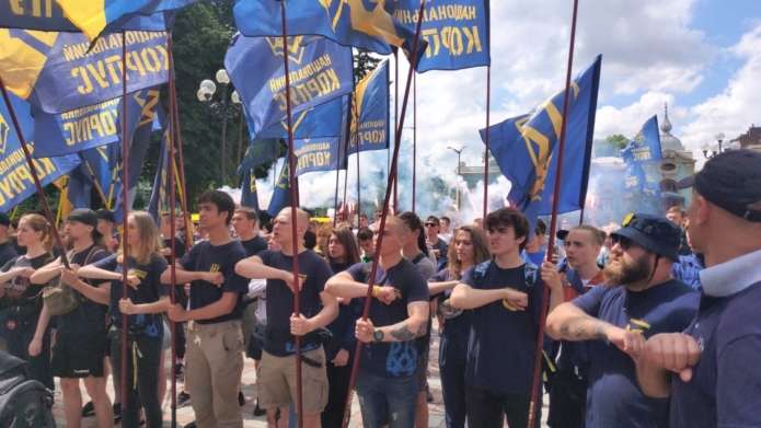 Представники Національного корпусу та добровольці святкують біля стін Верховної Ради прийняття законопроекту про соціальні гарантії для добровольців-іноземців.