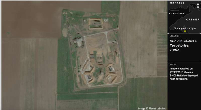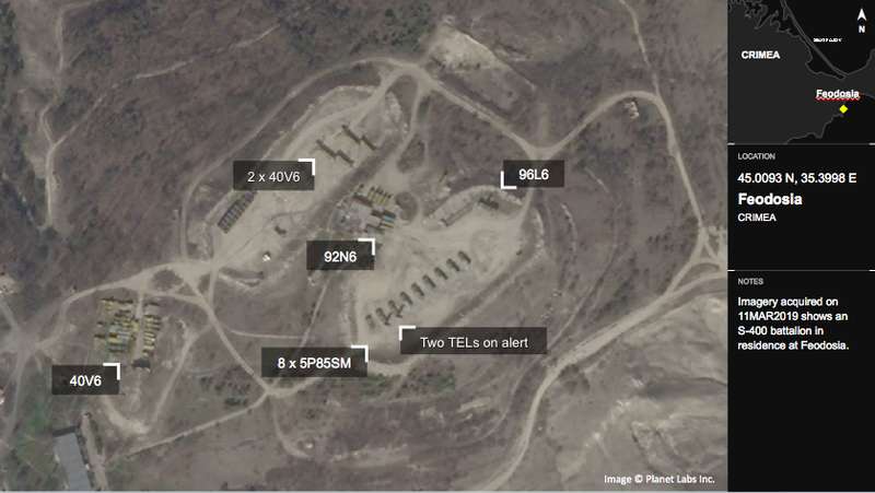 На снимках были показаны пять батарей С-400, пять систем ПВО С-300 и истребители в четырех местах. Также отмечены модернизированные военные объекты советской эпохи. Кроме этого, у РФ сейчас 81 военных самолет и вертолет в Крыму.