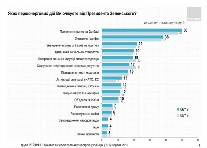 Еще 38%  – надеются на снижение тарифов, 22% – ожидают уменьшения влияния олигархов на политику, 20% – ждут повышения социальных стандартов, 19% – наказания виновных в коррупции чиновников, 17% – отмены неприкосновенности народных депутатов, 16% – повышение качества медицины, 13% – активизации сотрудничества с НАТО и ЕС, 12% – налаживания сотрудничества с Россией, 12% – укрепления украинской армии, 10%  – объединения страны.