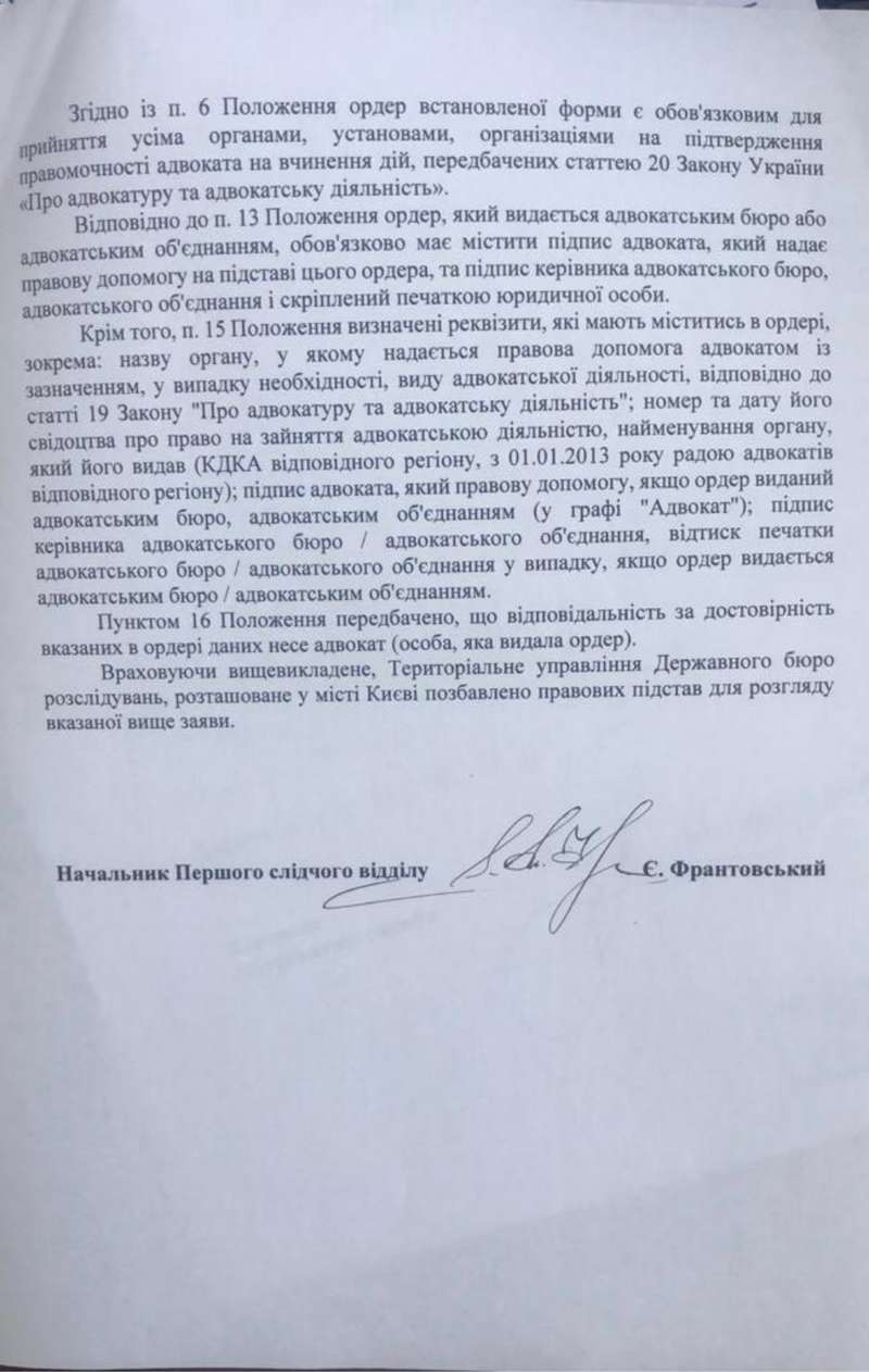 “На момент написания этого текста файл можно было скачать по этой ссылке. Вчера я таки получил это письмо по почте. Однако я получил другой экземпляр. Не тот, что был кем-то передан господину Портнову. Читатели сами могут убедиться в различиях в написании исходящего номера письма и подписи начальника Первого следственного отдела Е. Франтовского. Еще интересный вопрос. В тексте письма ГБР отсутствуют упоминания о сути моего обращения”,- утверждает адвокат Порошенко.