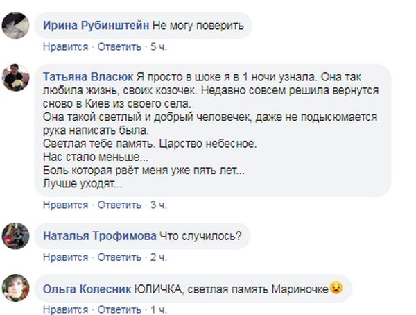 Авария произошла в районе села Носовка якобы из-за того, что машина на скорости влетела в кювет и врезалась в дерево. Автомобиль разбился полностью. Марина ударилась головой об боковое стекло. У попутчика погибшей женщины черепно-мозговая травма и травма руки. Он в сознании в больнице. Об этом написала Margo White.