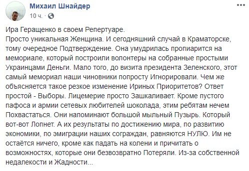 "Ира Геращенко в своем Репертуаре. Просто уникальная женщина. И сегодняшний случай в Краматорске, тому очередное подтверждение. Она умудрилась пропиарится на мемориале, который построили волонтеры на собранные простыми Украинцами Деньги. Мало того, до визита президента Зеленского, этот самый мемориал наши чиновники попросту игнорировали", — отметил Михаил Шнайдер.