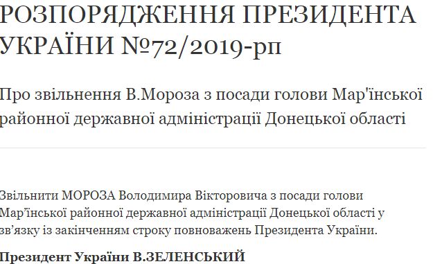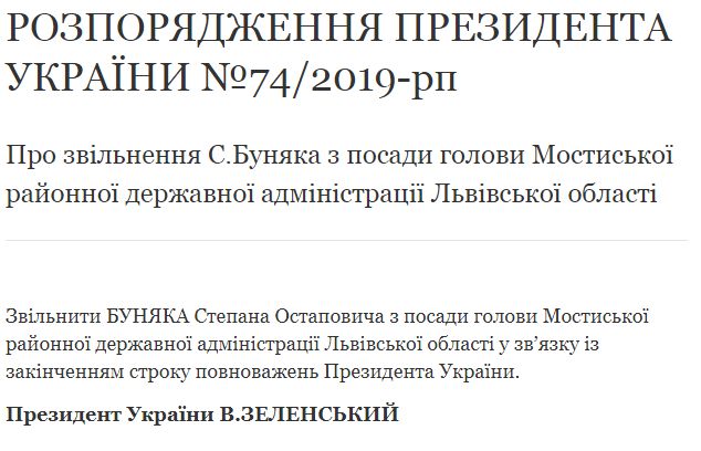 Так, согласно распоряжений №72/2019 - №75/2019, президент уволил глав Городоцкой РГА Владимира Ременяка, Мостинкой РГА Степана Буняка и Самбирской РГА Николая Фрея во Львовской области. Более того, Зеленский уволил главу Мариинской РГА Донецкой области Владимира Мороза.