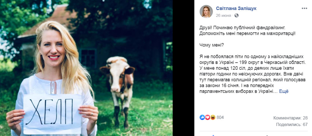 Нардеп Светлана Залищук начала поиск средств на избирательную кампанию. Однако, учитывая ее способность из ничего делать политическую карьеру (многие ли после Майдана смогли захапать пост нардепа в Раде?), я подозреваю, что деньги у нее на это стрёмное дело уже есть, но ей надо как-то «отмыть» это финансирование и отсюда идея про фандрайзинг.