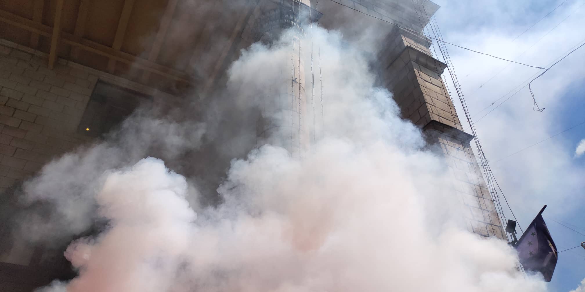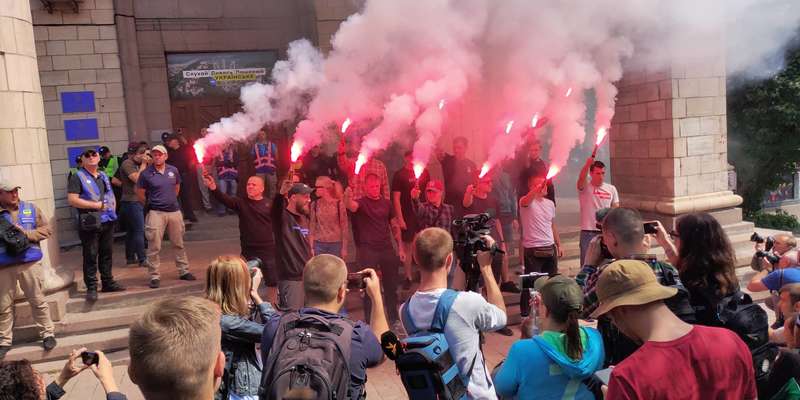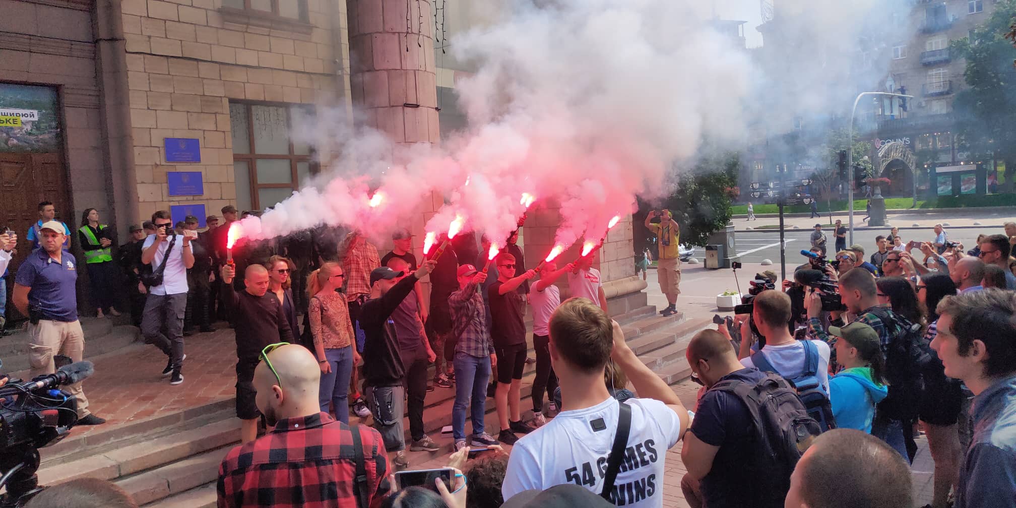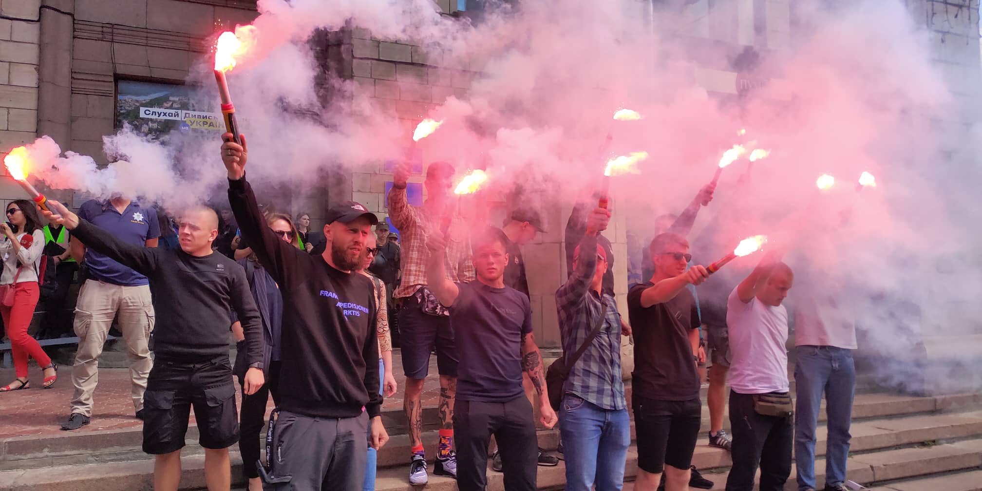 Протестувальники запалили фаєри вимагаючи від Ради, яка зараз проводить позачергове засідання, скасування ліцензії пропагандистському каналу NewsOne.