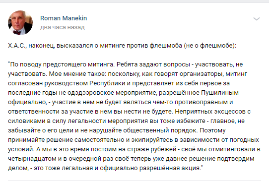 «Ребята задают вопросы — участвовать, не участвовать. Мое мнение такое: поскольку, как говорят организаторы, митинг согласован руководством Республики и представляет из себя первое за последние годы не одэдээровское мероприятие, разрешенное Пушилиным официально, — участие в нем не будет являться чем-то противоправным и ответственности за участие в нем вы нести не будете. Поэтому принимайте решение самостоятельно и экипируйтесь в зависимости от погодных условий. А мы в это время постоим на страже рубежей — свое мы отмитинговали в четырнадцатом и в очередной раз свое теперь уже давнее решение подтвердим делом, — это тоже легальная и официально разрешенная акция.»
