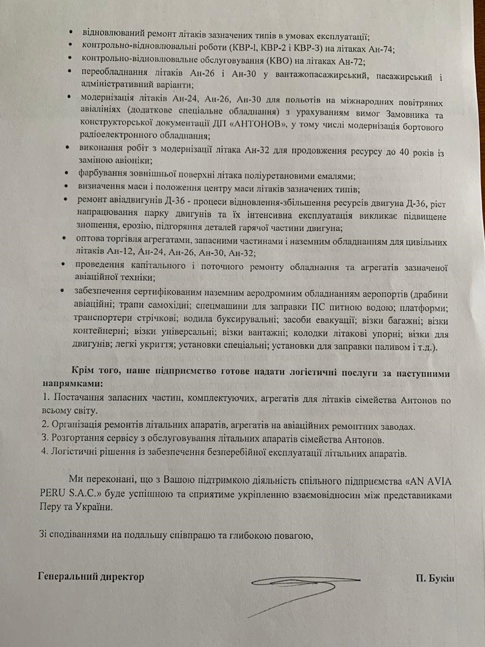 Примечательно, что документация нужна не «410 заводу гражданской авиации», а совместному предприятию AN AVIA PERU S.A.C (Перу). Как следует из госреестра этой южноамериканской республики, она была создана только 1 июля 2019 г. То есть «Укроборонпром» согласовывал компанию, не имевшую полной юридической регистрации. А согласно письму П. Букина в адрес посла Украины в Перу и МИД Украины (от 22 июля 2019 г.), еще незарегистрованная до конца AN AVIA PERU S.A.C 14 июня была представлена украинским дипломатам и руководству силовых ведомств Перу, эксплуатирующих «Аны». Согласно реестру, AVIA PERU S.A.C занимается «строительством и ремонтов морских судов и лодок», то есть к авиапрому отношений формально не имеет.