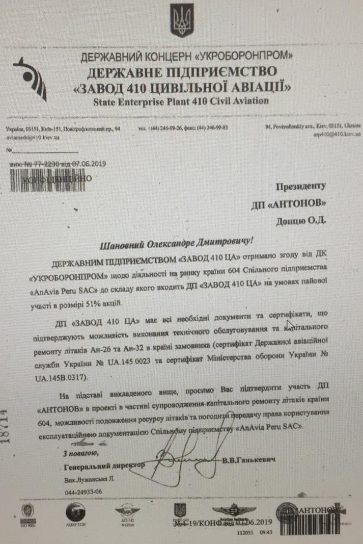 В частности, 7 июня 2019 г. генеральный директор «410 завод гражданской авиации» В. Ганькевич обратился к президенту ГП «Антонову» О. Донцу с запросом о предоставлении права использования эксплуатационной документации по самолетам семейства Ан. В письме он указывает, что на это уже получено согласие ГК «Укроборонпром».