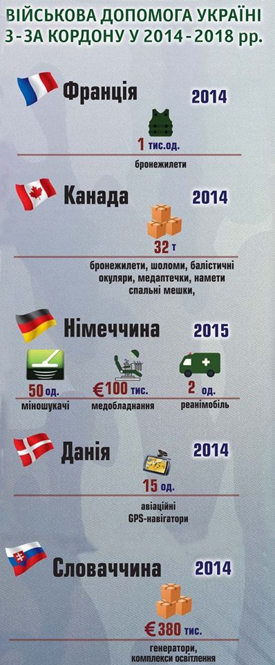 Великобритания помогла украинской армии защищенными ноутбуками, GPS-навигаторами, тепловизорами и т.д. Франция предоставила бронежилеты, Канада – различную амуницию, Германия – реанимобили, медицинское оборудование, Дания – GPS-навигаторы, а Словакия передала генераторы и комплексы осветления.
