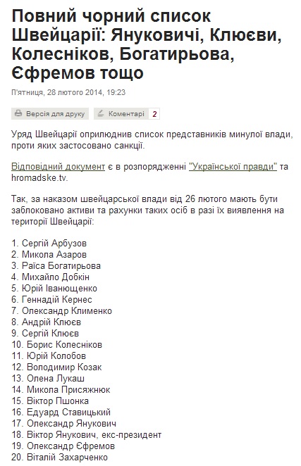 Список людей, которые подпали под санкции Швейцарии, Австрии и других стран, на удивление скуден.
