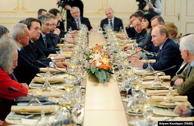 Головний редактор радіостанції «Ехо Москви» Олексій Венедиктов, генеральний директор ІТАР-ТАСС Віталій Ігнатенко, генеральний директор Першого каналу Костянтин Ернст (зліва направо) і прем’єр-міністр Росії Володимир Путін (другий праворуч) під час зустрічі з керівниками російських ЗМІ, 18 січня 2012 року