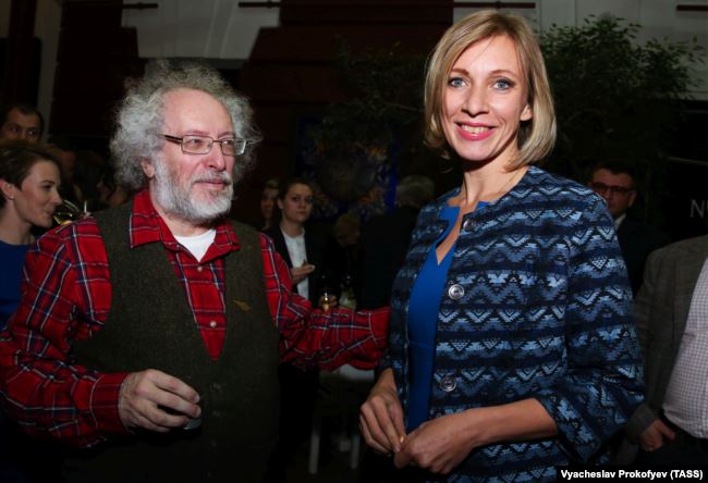 Головний редактор радіостанції «Ехо Москви» Олексій Венедиктов і офіційний представник МЗС Росії Марія Захарова в ресторані під час святкування дня народження радіостанції «Ехо Москви». Москва. 6 жовтня 2016 року