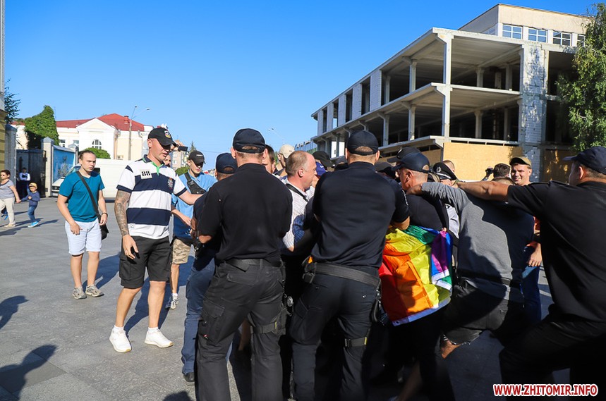 Подекуди виникали сутички та штовханина. Під час однієї із них правоохоронці затримали житомирянина Олега Піонтківського. Згодом, кілька чоловіків спробували кидати в учасників акції помідорами та курячими яйцями, втім, їм завадили це зробити.