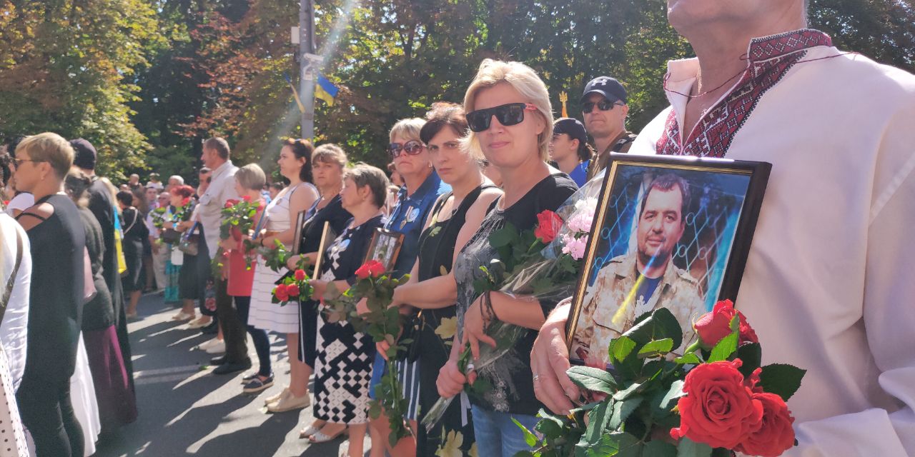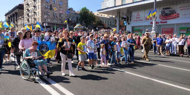 Ветерани несли прапори батальонів, в лавах яких вони воювали. Родичі загиблих воїнів несли в руках їхні портрети.