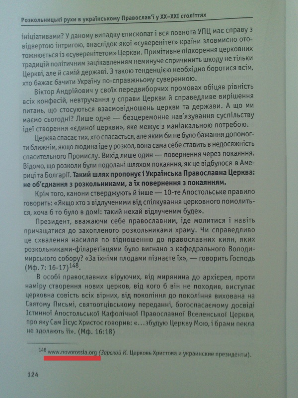 "Можете уявити той шок, який я відчула, перечитуючи список використаних джерел книги "Розкольницькі рухи в українському православ’ї у ХХ-ХХІ століттях", де був вказаний сайт www.novorossia.org (книга видана, між іншим, за благословенням митрополита Почаївського). Але дивує рік випуску книги і початку роботи сайту: 2009, коли звичайному обивателю навіть і не снилась військова агресія Росії проти України і створення т.зв. "Новороссії", - розповіла жінка.