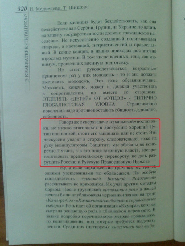 "… Говоря же о сверхзадаче "оранжевой" постановки, не нужно втягиваться в дискуссии: хороший Путин или плохой, стоит его защищать или не стоит. Эти дискуссии уводят в сторону, следовательно, тоже на руку манипуляторам. Защитить мы должны не конкретно Путина, а в его лице законную власть, воспрепятствовать предательскому перевороту, не дать разрушить Россию и Русскую Православную Церковь…"