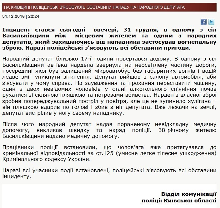 В день ЧП на сайте полиции появилось сообщение о происшествии, которое было описано со слов тогда еще народного депутата.