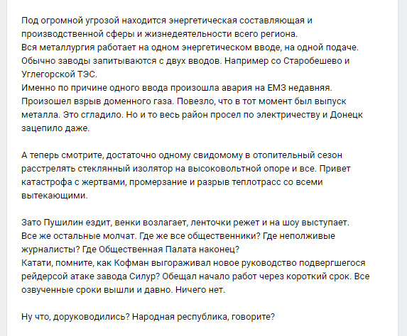 Вся металлургия работает на одном энергетическом вводе, на одной подаче. Обычно заводы запитываются с двух вводов. Например со Старобешево и Углегорской ТЭС. Именно по причине одного ввода произошла авария на ЕМЗ недавняя. Произошел взрыв доменного газа. Повезло, что в тот момент был выпуск металла. Это сгладило. Но и то весь район просел по электричеству и Донецк зацепило даже».