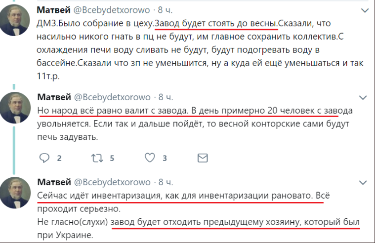 «Завод консервируется, сливается вода с систем охлаждения печей. Чтоб от морозов не поразрывало. При этом, под угрозой оказалось отопление прилегающих территория которые отапливались за счет отведенного тепла. Теперь все. В том числе и 6-я больница с роддомом. Колоссальный отток кадров. Люди уходят, едут в Россию, на Украину. Уже сейчас две печи не смогут работать при всем желании- нет кадров».