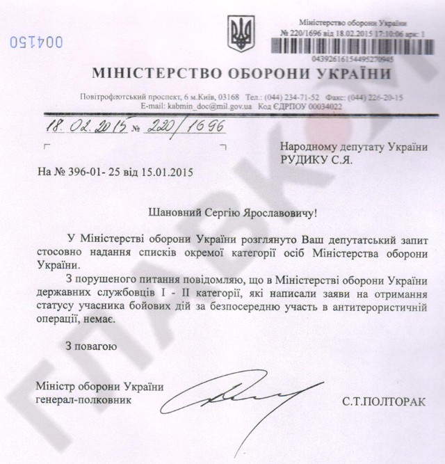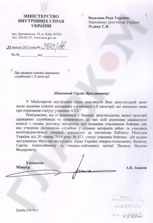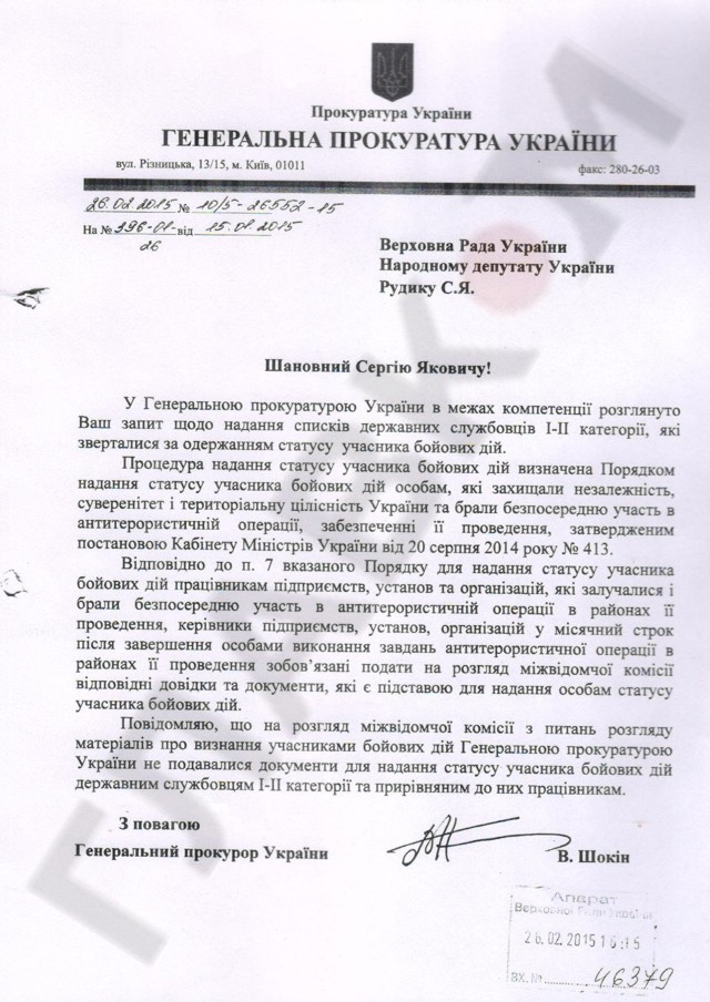 «Комиссия по вопросам рассмотрения материалов о признании участниками боевых действий в Службе безопасности Украины изучены и поданы на рассмотрение межведомственной комиссии документы относительно госслужащих 1-й категории главы Службы безопасности Украины Наливайченко В. А. и первого заместителя председателя СБУ – Артюхова Ю. Б.», - говорится в ответе на депутатский запрос народного депутата. На письме указана дата – 20 февраля. Не исключено, что за прошедший месяц межведомственной комиссией уже принято решение.