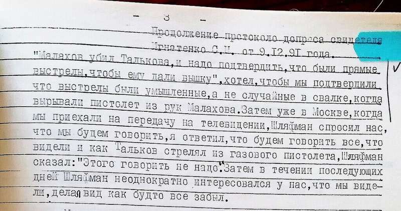 "Игорь по натуре был горячий человек, и даже бывший директор Талькова Влад Черняев после ухода говорил Шляфману, чтобы тот без согласия певца никого в гримерку не приводил. Считаю, что конфликт Талькова и Малахова был бы улажен, если бы Шляфман не вмешался, не подбежал к Талькову после ссоры и не попросил бы пистолет, акцентировав внимание на том, что у Малахова в руках револьвер", - говорит охранник Талькова Сергей Игнатенко.