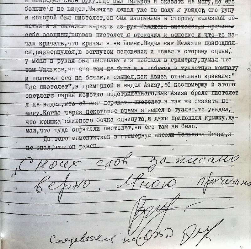 "Вырвав пистолет из рук Малахова, я отскочил к решетке и что-то стал кричать. У меня в руках был пистолет, и я побежал в гримерку, думал, что там Тальков. Но его там не было, и я побежал в туалетную комнату. Положил пистолет на бачок. Я слышал, как Азиза отчетливо кричала: "Где пистолет?". До того момента, как в гримерную внесли Игоря Талькова, я не знал, что он ранен".