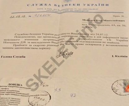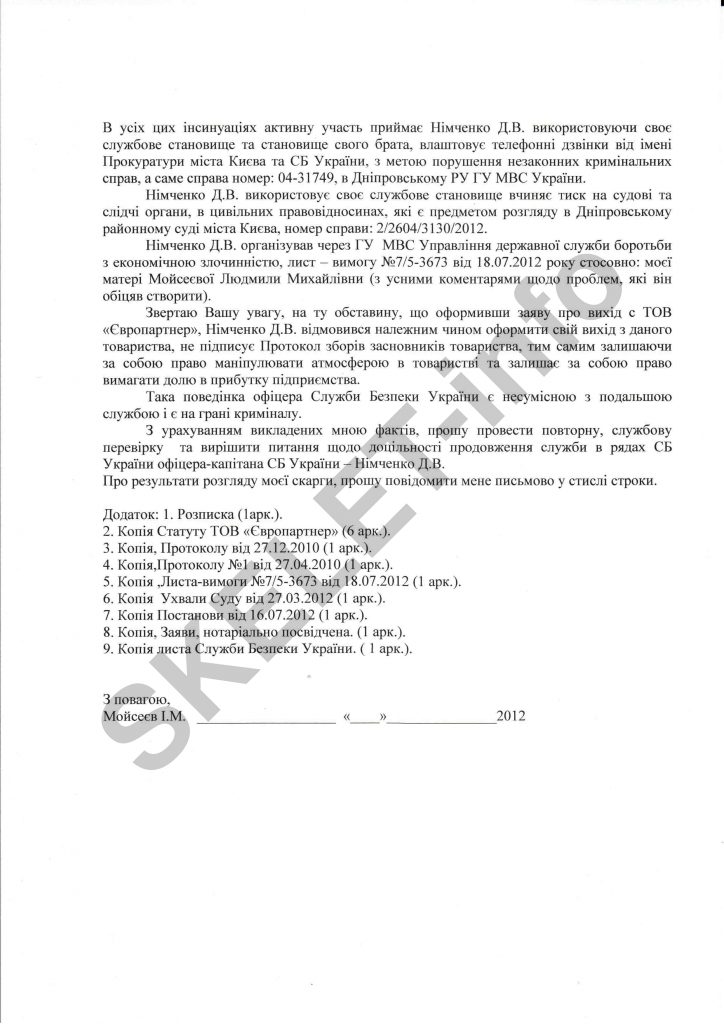 Но какой смысл жаловаться в СБУ на сотрудника УВБ СБУ?! И Моисееву пришла отписка от тогдашнего главы СБУ Игоря Калинина, утверждающая что «информация о возможных неправомочных действиях Дмитрия Нимченко не подтверждена». Тогда Моисеев обратился с заявлением на имя генпрокурора Виктора Пшонки. Но, опять же, какой смысл было жаловаться генпрокурору (тем более Пшонке) на брата прокурора? Результат был таким же…