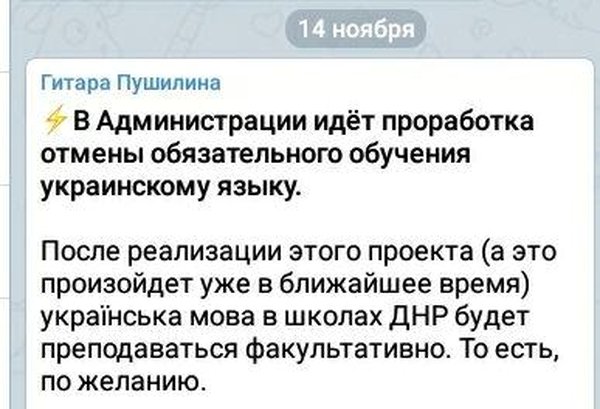 «В администрации (Пушилина. — Авт.) идет проработка отмены обязательного обучения украинскому языку. После реализации этого проекта (а это произойдет уже в ближайшее время) українська мова в школах „ДНР“ будет преподаваться факультативно. То есть по желанию», — написал на своей странице в соцсети «ВК» главарь оккупационной администрации Горловки Иван Приходько. А Приходько не просто «градоначальник», которому прочат повышение, а, можно сказать, рупор общественного мнения — член многих влиятельных общественных советов, подконтрольных кремлевским кураторам «республики».
