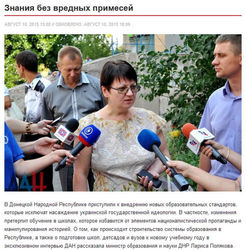 Школы сразу же перешли на российские программы обучения. А бывший «министр образования ДНР» Лариса Полякова, недавно мигрировавшая в Россию, настолько рьяно искореняла украинский язык в образовании, что даже дистанционные онлайн-курсы по украинскому языку и литературе, истории и географии Украины, разработанные для школьников оккупированного Донбасса, назвала «пропагандой украинского националистического мировоззрения» и призвала педагогов, учащихся и их родителей быть бдительными — «правильно оценивать подобные „инициативы“, поскольку данный шаг — не что иное, как завуалированное проявление политики национализма, в данном конкретном случае — лингвистического».
