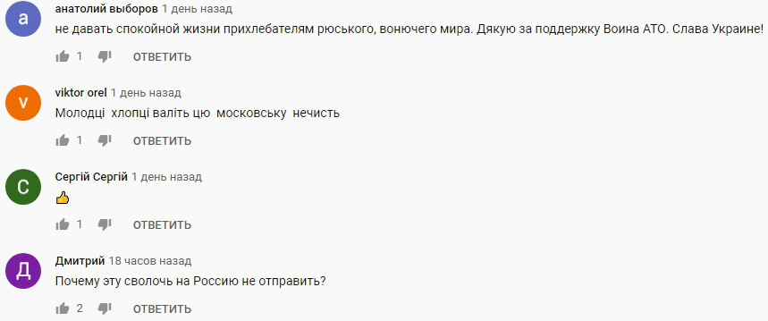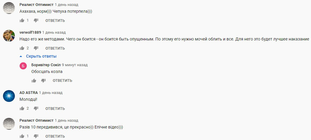 "Нарешті приємна новина", "Тополиный пух квадрат петух", "Молоді! А цьому жирному пі*арасу треба зрозуміти, що в’язниця для нього це гарантія здоров’я та життя", "Надо его же методами. Чего он боится - он боится быть опущенным. По этому его нужно мочей облить и все. Для него это будет лучшее наказание", "Молодці хлопці валіть цю московську нечисть", "Почему эту сволочь на Россию не отправить?".