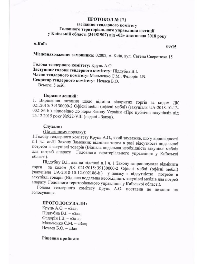 У цивілізованих країнах в тендерах прагнуть взяти участь багато фірм. Власне для цього тендер і проводиться, щоб конкуренти гризлися і пропонували кращу ціну і кращі умови. Так повинно бути і так є. У всьому світі, але не в ГТУЮ Київської області. 12 жовтня 2018 року ГТУЮ оголошує тендер на поставку офісних меблів. На тендер надходять пропозиції від десятка різних учасників. Меблі на будь-який смак і ціни адекватні: 380 тисяч, 390 … Але тендер раптом скасували. А знаєте чому? Відпала необхідність! Рішення про скасування тендера закріпили протоколом, з яким можна ознайомитися нижче.
