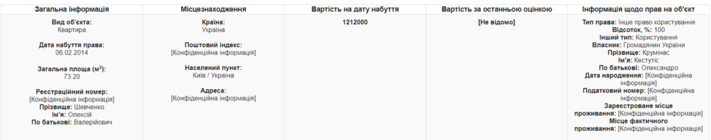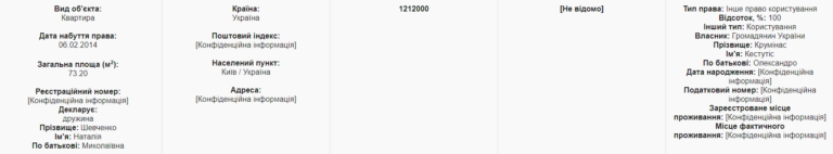 Щоб квартира не пустувала, Олексій Валерійович живе в ній разом з сім’єю. При цьому в декларації датою придбання квартири Олексій Шевченко вказав 06.02.2014 року. цією датою квартира була придбана Крумінасом Кестутісом – свояком Олексія Шевченка. Вносити до декларації нову дату Олексій Шевченко не став, щоб не привертати уваги до факту придбання декількох квартир в один день.