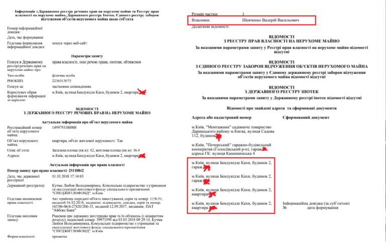 За всі незаконно зароблені кошти Олексій Шевченко купує нерухомість і оформляє на батьків-пенсіонерів. Крім того на батька оформляються автомобілі преміум-класу, якими користується сам Олексій Валерійович Шевченко (і ремонтує за рахунок ГТУЮ). У декларації Шевченка зазначено, що річна зарплата в 2018 році склала 962.916 грн. У подружжя в три рази менше. Плюс заощаджень у сім’ї Шевченко задекларовано близько 1.5 млн. Гривень. Звідки гроші на нерухомість? Звідки гроші на BMW X6?