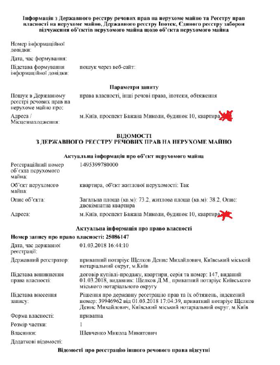 Але Олексій Валерійович Шевченко 1 березня 2018 роки купив не тільки дві квартири на Печерську, які оформив на свого батька. В цей же день була куплена як мінімум ще одна квартира по вулиці Миколи Бажана, 10 в м.Києві. В цьому будинку вартість квартири стартує від 1200 доларів за квадратний метр. Відповідно, вартість придбання становить понад два мільйони гривень. Цього разу квартира вже оформляється на батька дружини – Шевченко Миколи Микитовича. Можна далі шукати квартири Олексія Валерійовича Шевченка, але наявної інформації вже достатньо, щоб поставити незручні питання начальнику ГТУЮ Київської області Олексію Шевченко про джерела доходів.