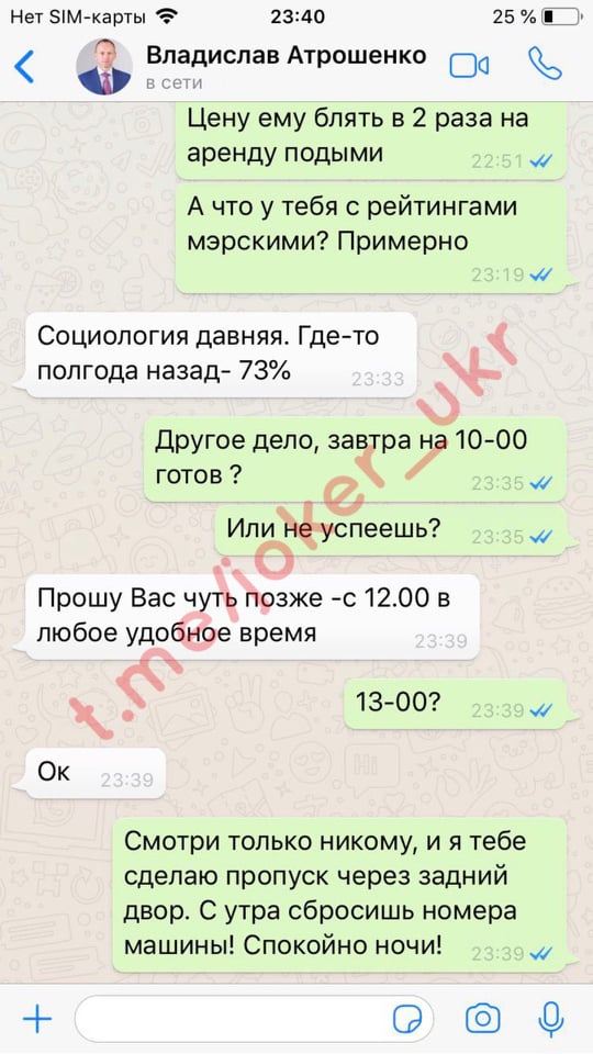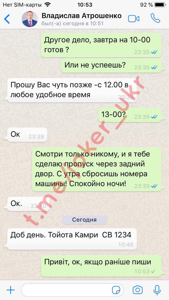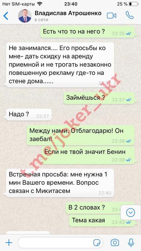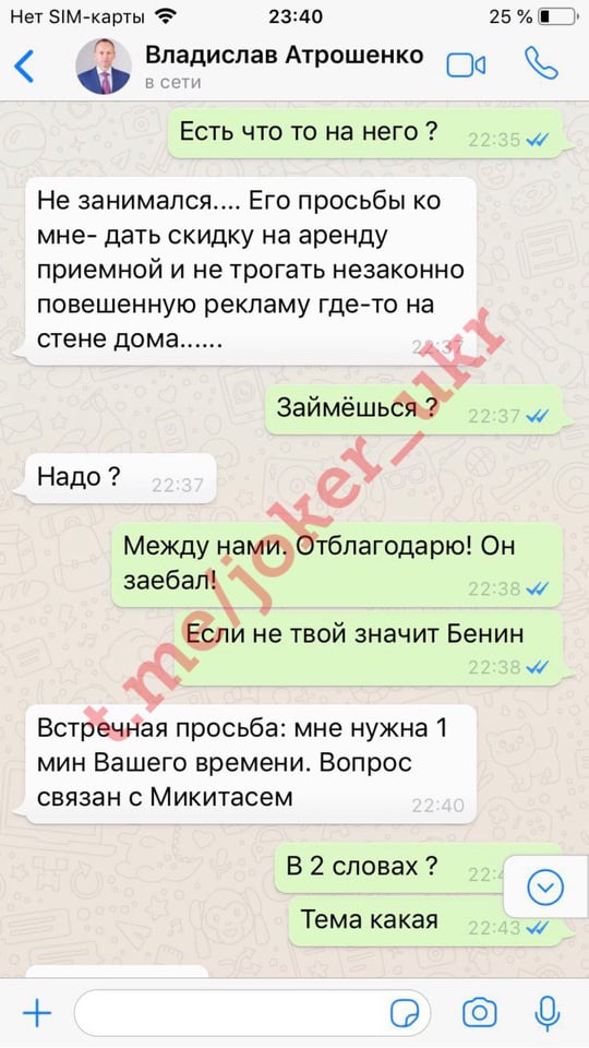 Как видно из переписки, Атрошенко пытается наладить контакт с офисом Зеленского и с его главой Богданом, при этом делает это он в особо подобострастной манере, отвечая на откровенно хамские сообщения «Богдана». Так же Антрошенко сильно озабочен судьбой Микитася, которого обвиняют в разворовывании бюджетных средств и его корпорации «Укрбуд».