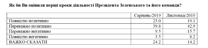 "Первые шаги деятельности президента и его команды 62% граждан Украины оценивают позитивно (19% – полностью позитивно, 43% в основном позитивно). Негативные оценки дали 24%, что в два раза больше, чем в августе", – говорится в результатах исследования.
