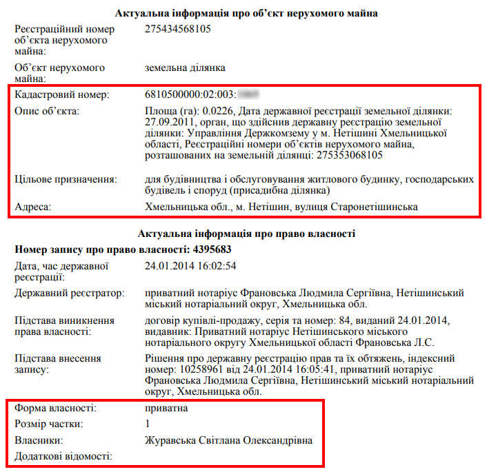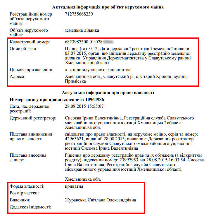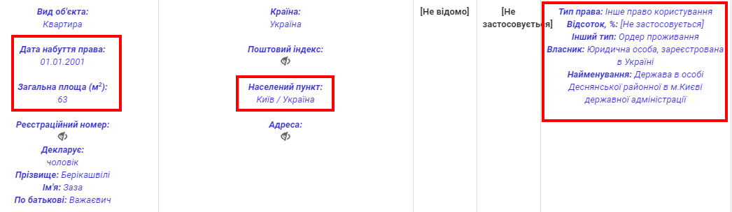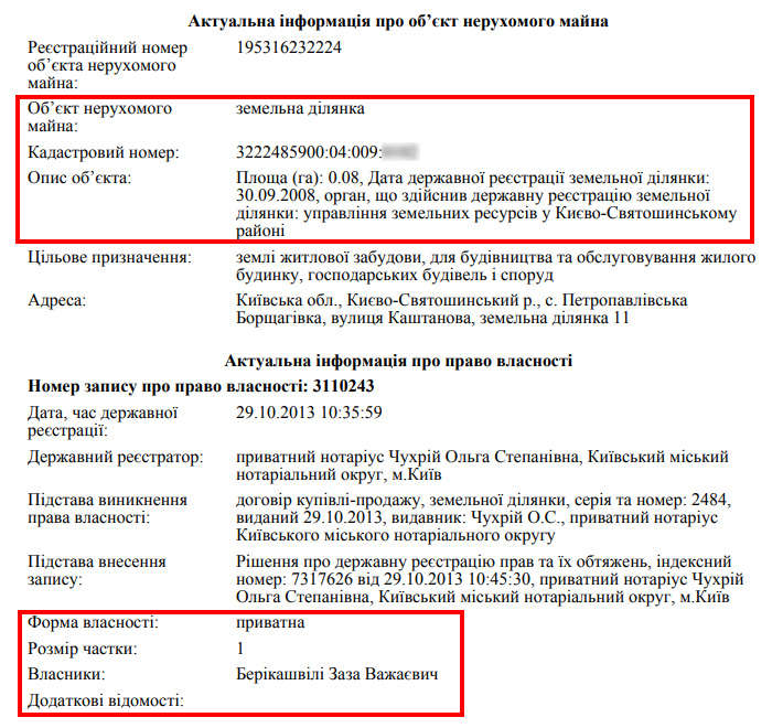 На этом задекларированное имущество закончилось. Теперь - самое интересное. Согласно кадастровой карте, на гражданине Берикашвили Заза Важаевиче зарегистрирован еще один земельный участок в Киевской области площадью 0,12га, предназначенный для жилищного строительства. Почему декларация судьи Журавской не содержит ни одного упоминания об указанном имуществе?