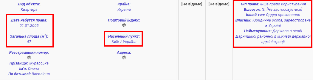 Журавская не владеает квартирами, но прописана в Киеве и там же имеет служебное жилье площадью 47 кв. м. Ее муж также пользуется квартирой Деснянского райсовета.