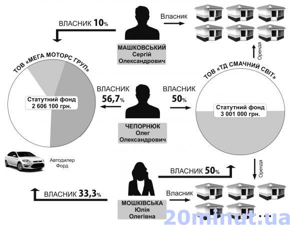 Але найголовніше, що спільним для усіх є автомобільний бізнес. ТОВ “Мега Моторс груп” об’єднує інтереси та власність Сергія Машковського, Юлії Мошківської та Олега Чепорнюка. Останній, як і у випадку з мережею роздрібного продажу, є директором і цього підприємства. Отже, для голови обласної державної адміністрації, використання МАФів ТОВ “Торговий дім Смачний світ” не є марною справою, а відчутна підтримка партнерів по бізнесу.