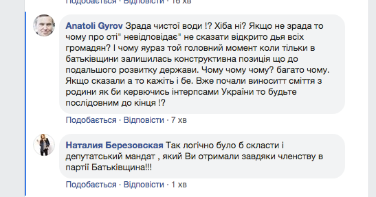 “Для меня это проявление слабости, ведь “Батькивщина” перешла в оппозицию и это тяжелое испытание. Нам предстоит серьезная борьба за интересы Украины: за честный рынок земли, за сохранение стратегической собственности страны, за справедливые тарифы для населения. Мы готовы к борьбе. Что касается других – я не знаю”, – резюмировал он.