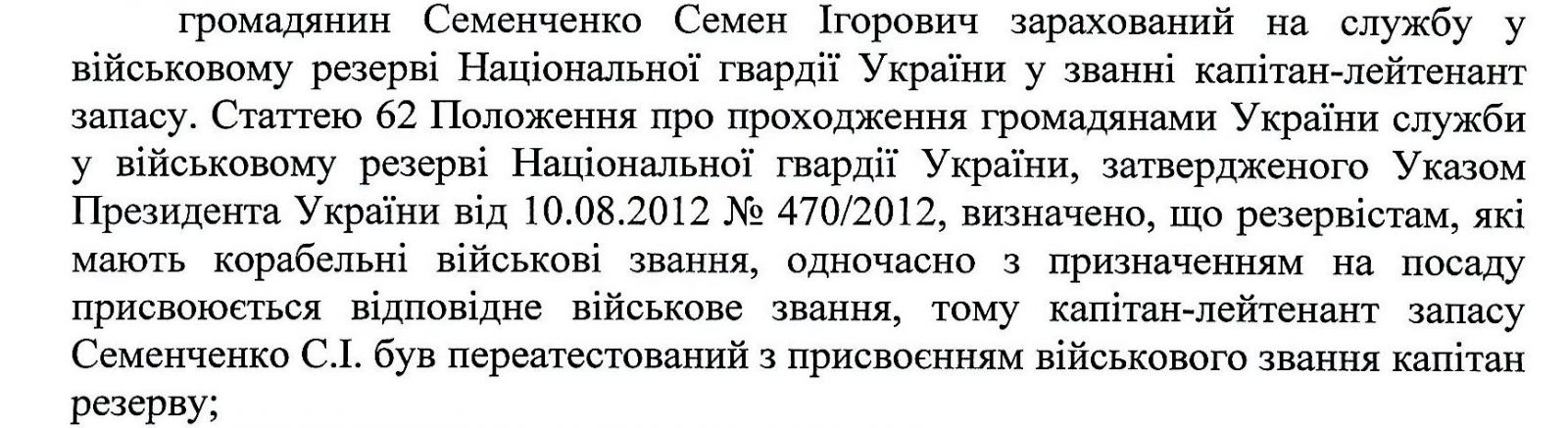 порядку переатестації: при зарахуванні на міліцейську службу Семенченко, мовляв, був капітан-лейтенантом Військово-морських сил України в запасі, тому «капітан-лейтенант запасу Семенченко С.І. був переатестований с присвоєнням військового звання капітан резерву». Ось, будь ласка, витяг з попередньої відповіді Нацгвардії та подання Авакова про нагородження героя.