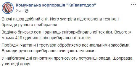 В Киеве еще ночью начали расчищать улицы от внезапно выпавшего снега. Всего задействовали 418 единиц техники.