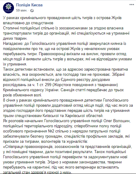 "Сотрудничество правоохранителей, зоозащитников и представителей организаций, в которые помещены животные, дали положительные результаты. Также полицейские Голосеевского управления полиции проверили и задокументировали новые условия содержания тигров. Согласно нормам законодательства, животные находятся на карантине, во время которого ветеринары установят общее состояние здоровья каждого из них".