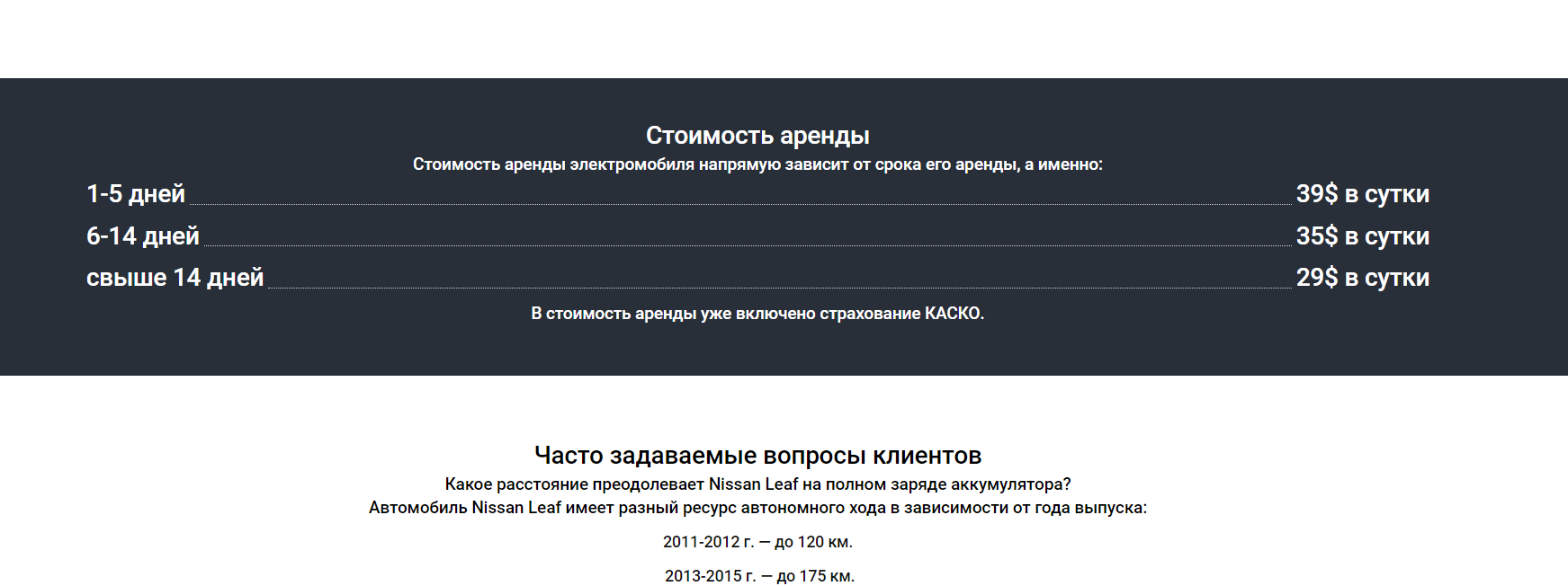 Проанализировав некоторые сайты, которые занимаются продажей и арендой аналогичных автомобилей было установлено, что стоимость аренды автомобиля Ниссан Лиф свыше 14 дней составляет 29$ в сутки, что примерно равно 705 гривен в сутки.
